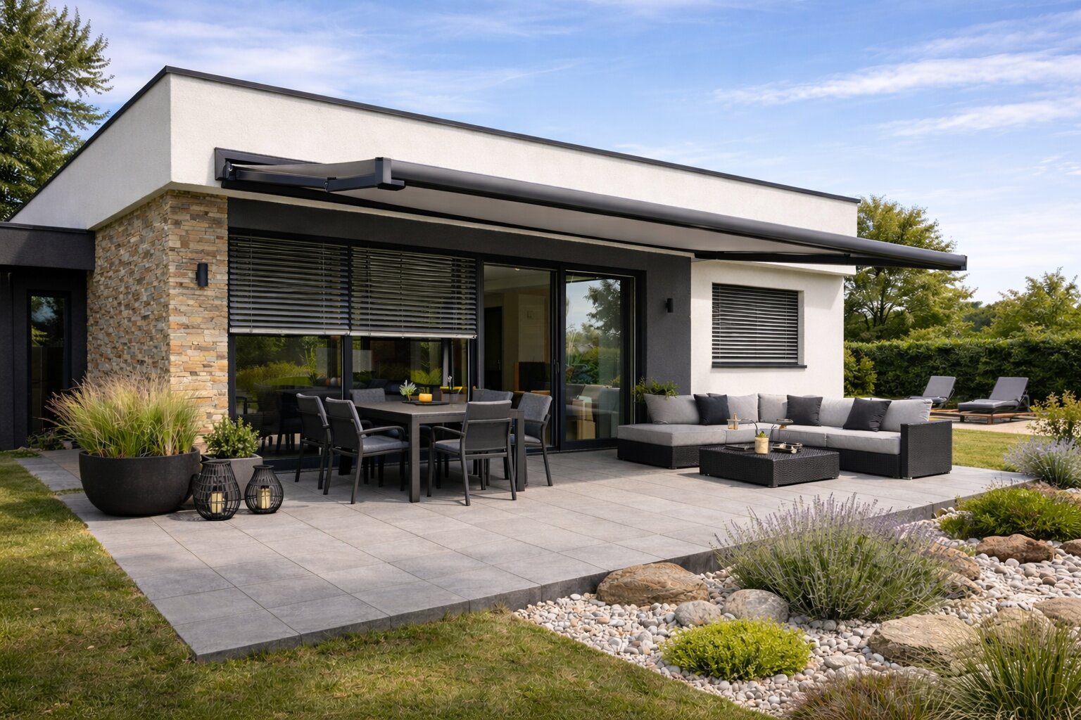 - Markýza nebo hliníková pergola udělá z terasy místo, kde můžete být i v poledne